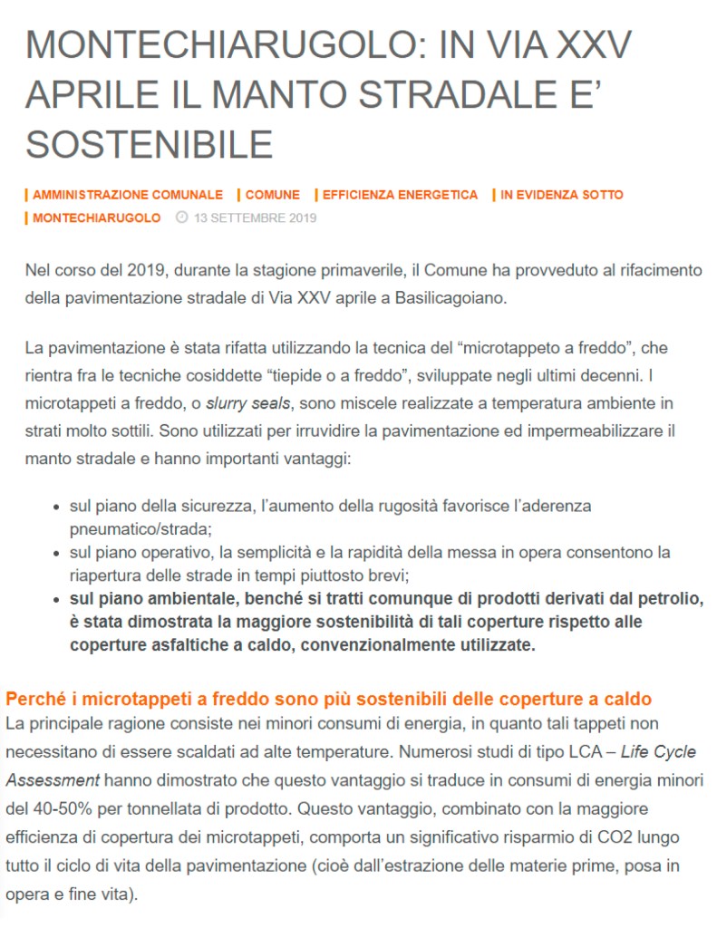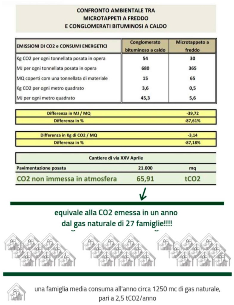 Le pavimentazioni con microtappeto a freddo realizzate dalla nostra azienda permettono di abbattere le emissioni di CO2 di oltre l’80% rispetto ai tradizionali sistemi di asfaltatura a caldo, per approfondire clicca qui